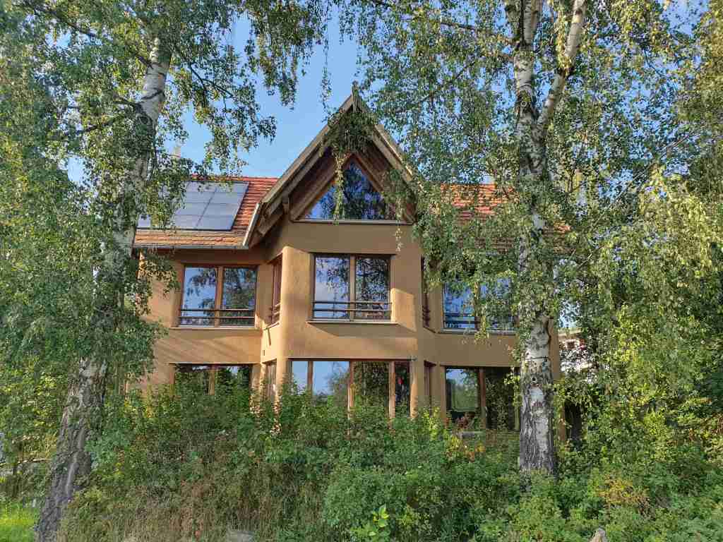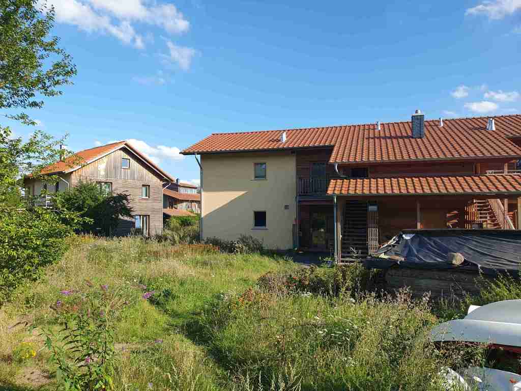 Auf dem Weg nach Sieben Linden sind wir mit dem Bus noch durch ein konventionelles Neubaugebiet gefahren und wir können sagen: der Kontrast könnte größer nicht sein. Während der herkömmliche Neubau nicht nur hässlich, immergleich, nebeneinander gestopft und völlig funktional wirkt (häufig werden die wenigen Chancen auf etwas Grünes durch Steingärten vertan) sind die Häuser in Sieben Linden einfach schöner auf allen Ebenen. Gern geben wir euch ein Beispiel:
