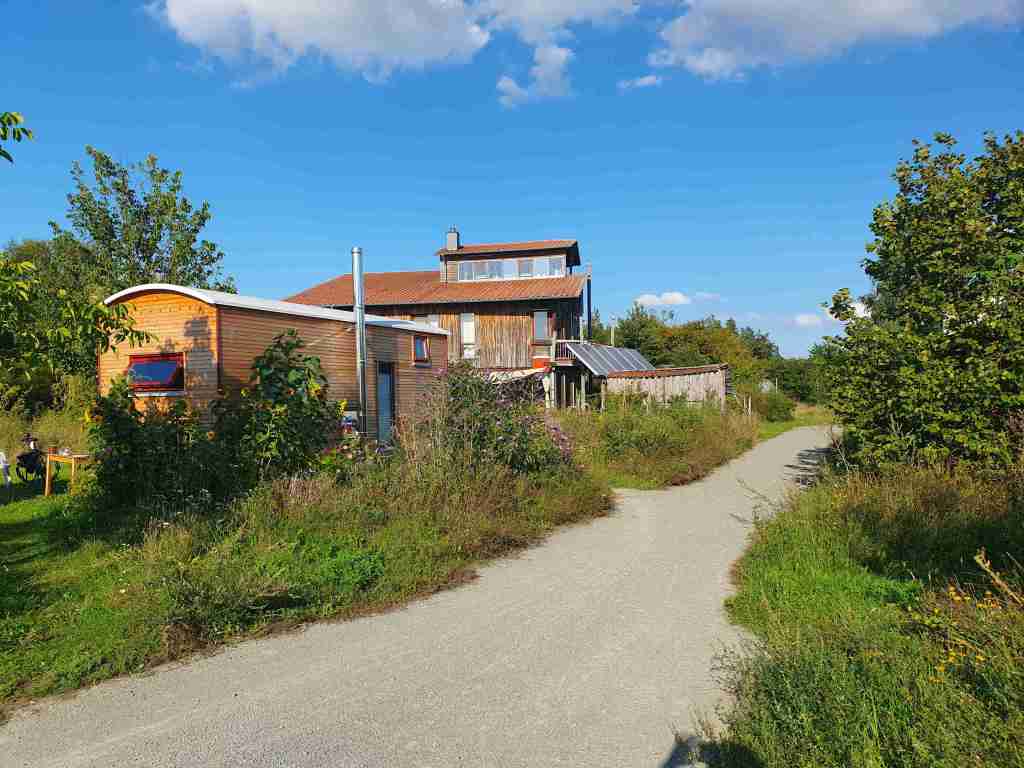 Kein Gebäude ist wie das andere und sie sind nicht alle in Reih und Glied gebaut, sondern stehen etwas freier auf dem Gelände – immer in 3er oder 4er Gruppen. Durch die häufig beigen/braunen Farbtöne der Häuser, Holzverschalungen und Fenstereinfassungen aus Holz wirken die Häuser auch irgendwie so, als ob sie in die Natur passen würden. Die Bauwägen sorgen für das nötige Öko-Feeling 😉 (Obwohl sie verglichen mit den Strohballenhäusern schlechter abschneiden), fügen sich aber auch toll ins Gelände und wecken den Wunsch in uns, auch mal eine Zeit (oder unser Leben?) in einem Bauwagen oder Tiny-Haus zu leben.