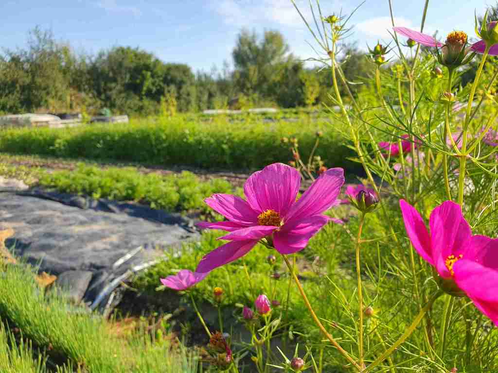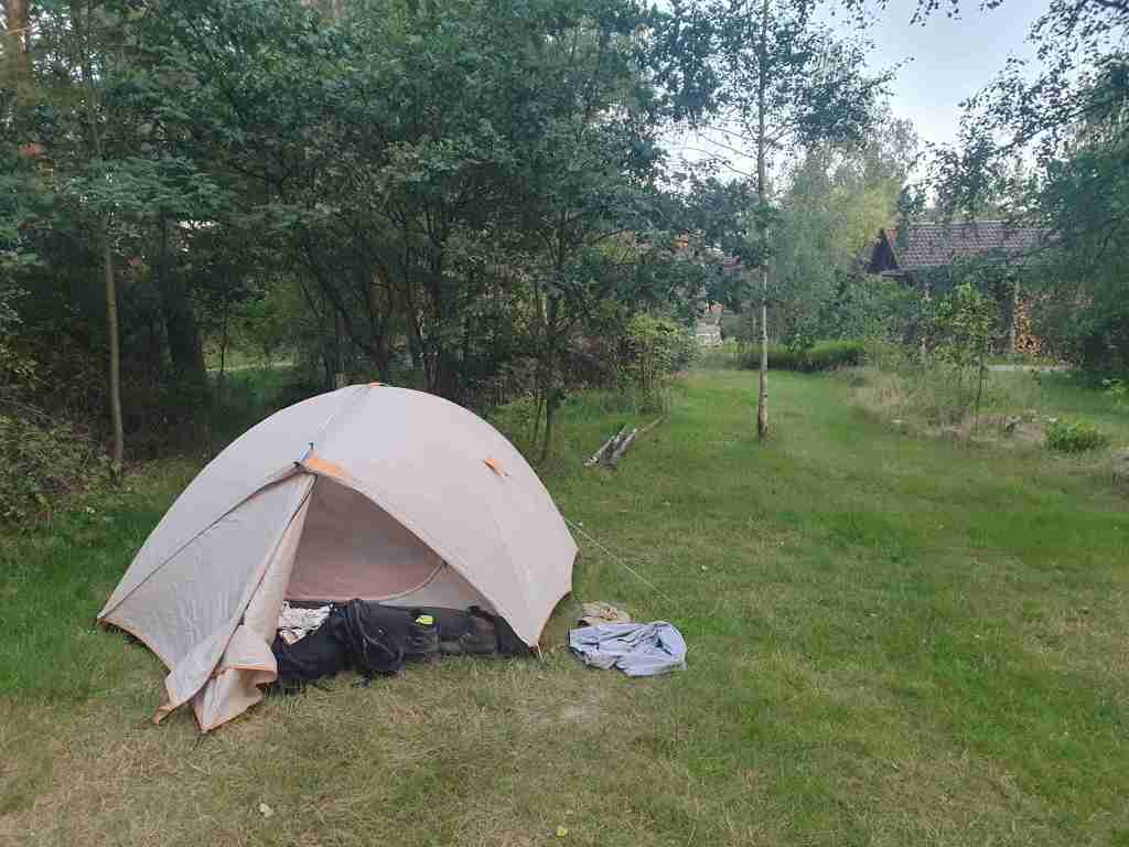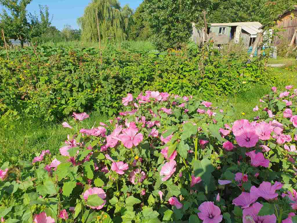 Wir laufen über einen Schotterweg… rechts von uns ragen hohe, silberne Kamine über das Dickicht. An mehreren Stellen treffen wir auf wilde und bunte Wiesen, die wie ein Paradies für Bienen und Insekten wirken. Alles um uns herum wirkt natürlich, belebt und bunt. Der Wald ist nur einen Katzensprung entfernt und einen Zaun als Waldkante vermisst man hier…. oder auch nicht? Ich finde es schön, ohne Begrenzung direkt an der Waldkante zu zelten. Der Garten wirkt wie die Inkarnation eines Garten Eden und lockt nicht nur mit unzähligen, verführerischen Snacks sondern wirkt trotz seiner wilden Unordnung dennoch organisiert und „gekonnt“. Hinter einem Busch entdecken wir einen kleinen Badesee, in dem sich Kinder den heißen Tag zum Strandtag machen und die Häuser wirken irgendwie organisch in die Natur „eingepasst“… Sowie die vielen Bauwägen, die eine gewisse „Einfachheit“ des Lebens ausstrahlen.