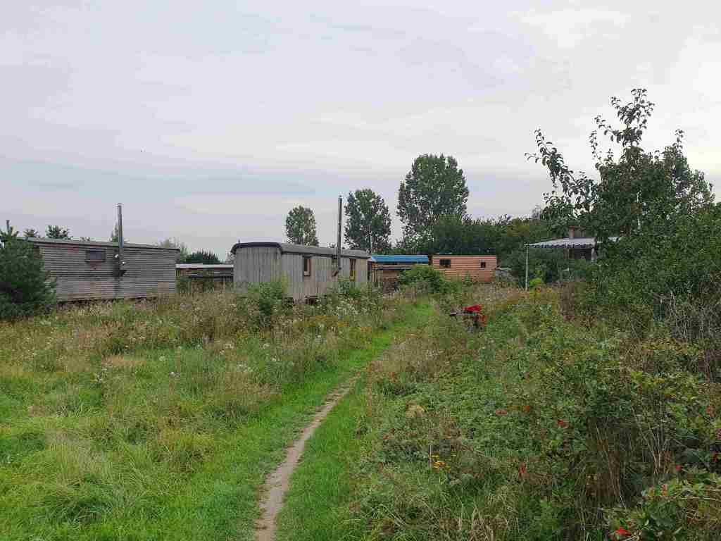 Es gibt auch 50 bewohnbare Bauwägen im Dorf. Das schafft eine besondere Atmosphäre, ist aber aufgrund der fraglichen ökologischen Bilanz nur eine Übergangslösung, bis wieder ein neues Haus gebaut wird (Ziel: min. 300 Dorfbewohner in Häusern). Alle Menschen, die hier leben, sind angehalten irgendwann in ein Haus zu ziehen, so schön das Leben im eigenen Bauwagen auch sein mag.